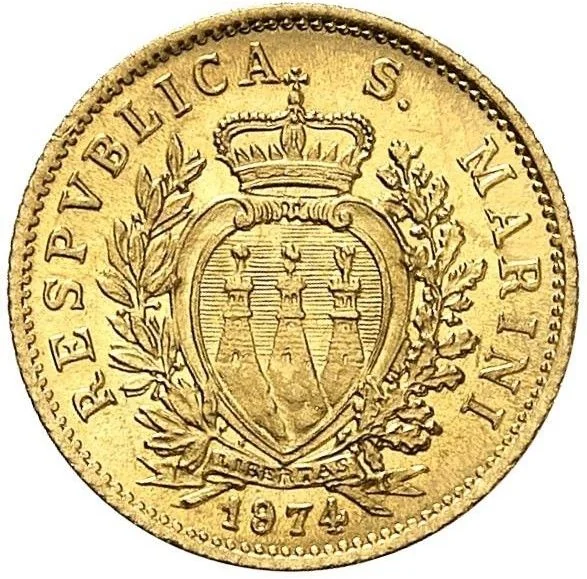 In 1974, San Marino’s currency situation was fundamentally defined by its close economic and monetary integration with Italy, governed by a series of bilateral treaties. The most important of these was the Convention of 1939, which established the Italian Lira as legal tender within the republic and granted San Marino limited rights to mint its own coinage. These Sammarinese coins, denominated in lire, were legally equivalent to their Italian counterparts and circulated interchangeably, but they were produced in strictly limited quantities, primarily for commemorative and collector purposes rather than for driving the domestic economy. The country had no central bank and did not issue paper currency, relying entirely on Italy for its circulating medium.