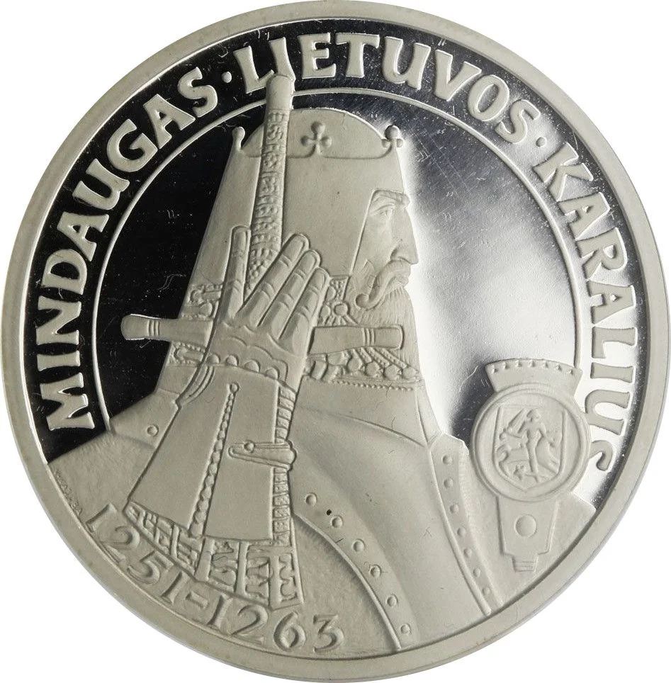The reverse features a portrait of King Mindaugas by sculptor Vytautas Kašuba, surrounded by the inscription MINDAUGAS LIETUVOS KARALIUS, with the years 1251-1263 below.