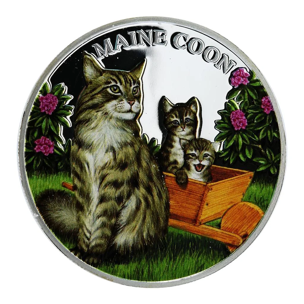 Maine Coon cat with two kittens in a wheelbarrow, surrounded by flowers.