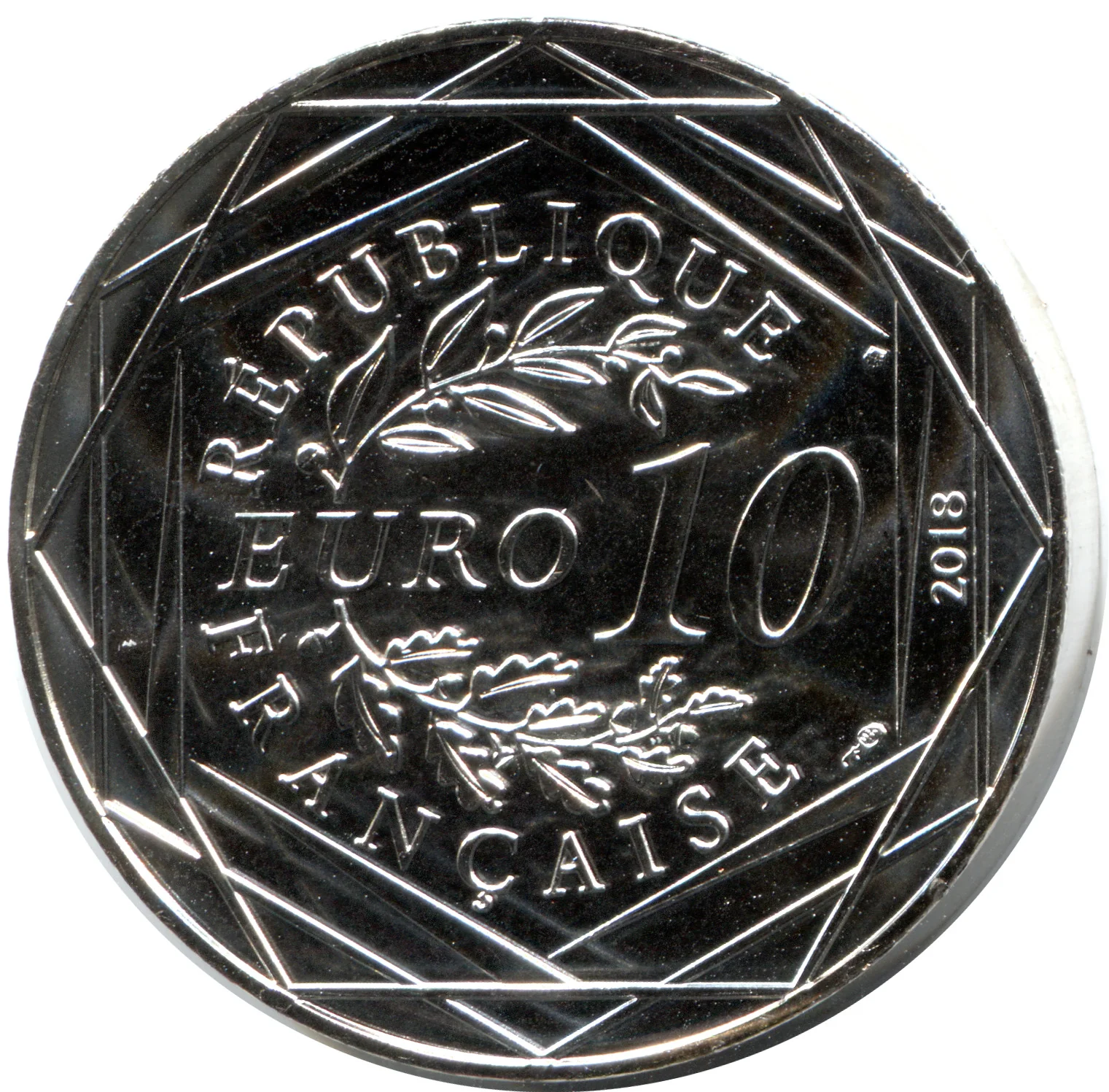 The obverse features the face value with oak and laurel branches, suggesting the Euro sign. The reverse motifs are framed by lines forming France's hexagon.