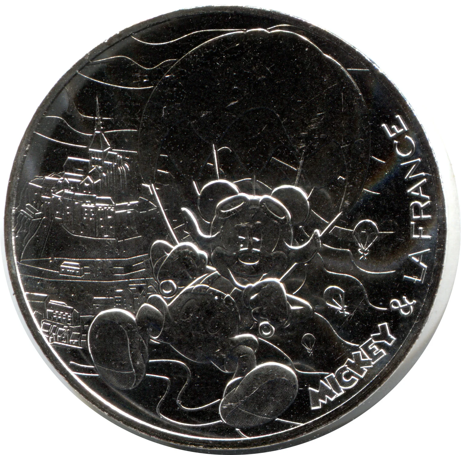 On the coin's reverse, Mickey parachutes toward Mont Saint-Michel bay.