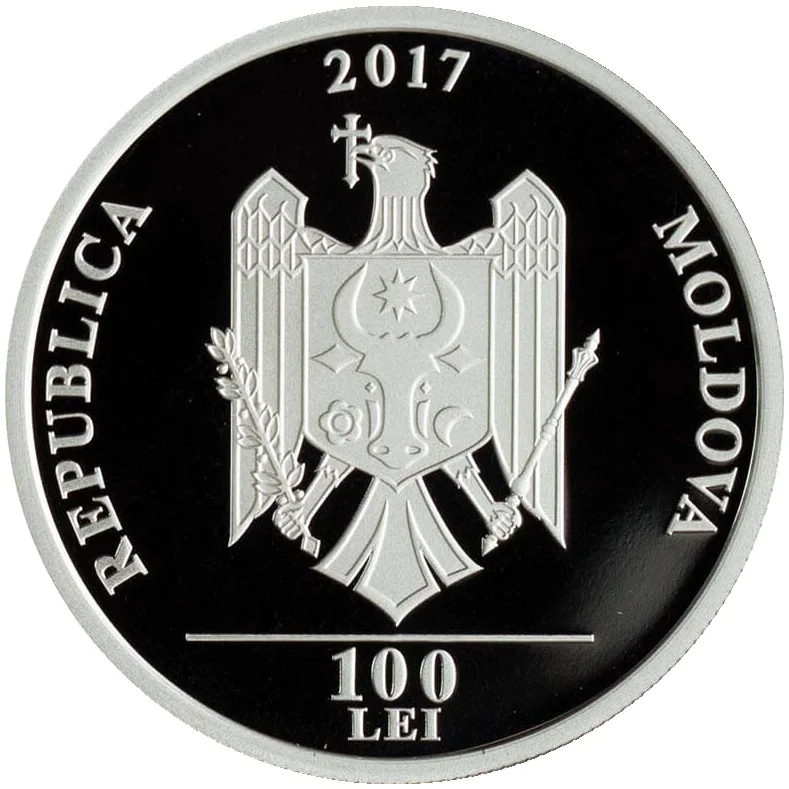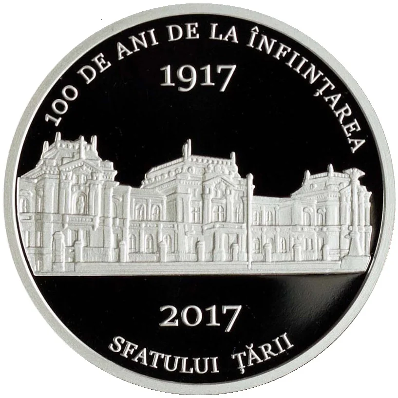 - top: engraved text "100 DE ANI DE LA ÎNFIINȚAREA" and year "1917";