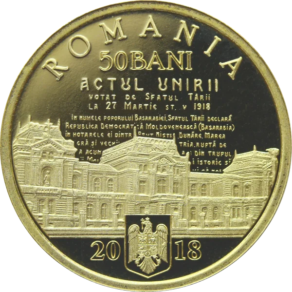 Foreground: The National Council building in Kishinev, where Bessarabia's union with Romania was voted on 27 March 1918. Background: An excerpt from the Union Act, with the arched inscription "ROMANIA", face value "50 BANI", Romania's coat of arms, and issue year "2018".