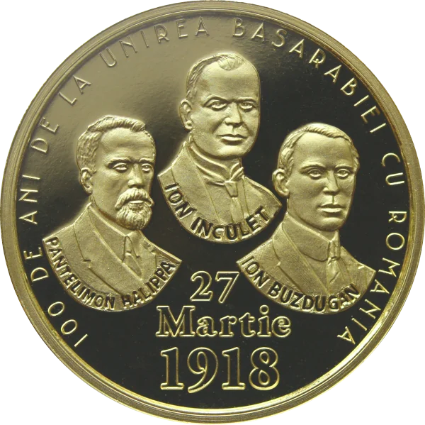 Portraits and names of the Union Act signatories: Ion Inculeț (Chairman), Pantelimon Halippa (Vice-Chairman), and Ion Buzdugan (Secretary). Inscriptions: "100 DE ANI DE LA UNIREA BASARABIEI CU ROMÂNIA" and "27 Martie 1918".