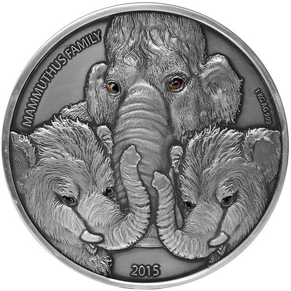 The reverse shows a mammoth family with a Real Eye Effect, inscribed "Mammuthus Family," alongside the silver specifications and issue date.