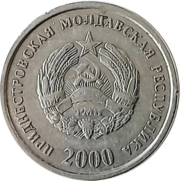 PMR State Emblem with the circular inscription “Приднестровская Молдавская Республика.” The mint year "2000" is below.