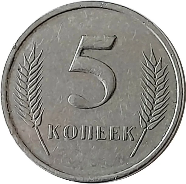 A 5-kopeck coin with wheat ears and the denomination in Cyrillic.