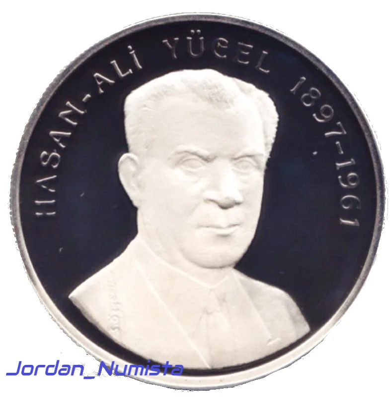 Portrait of Hasan Ali Yücel with caption above.