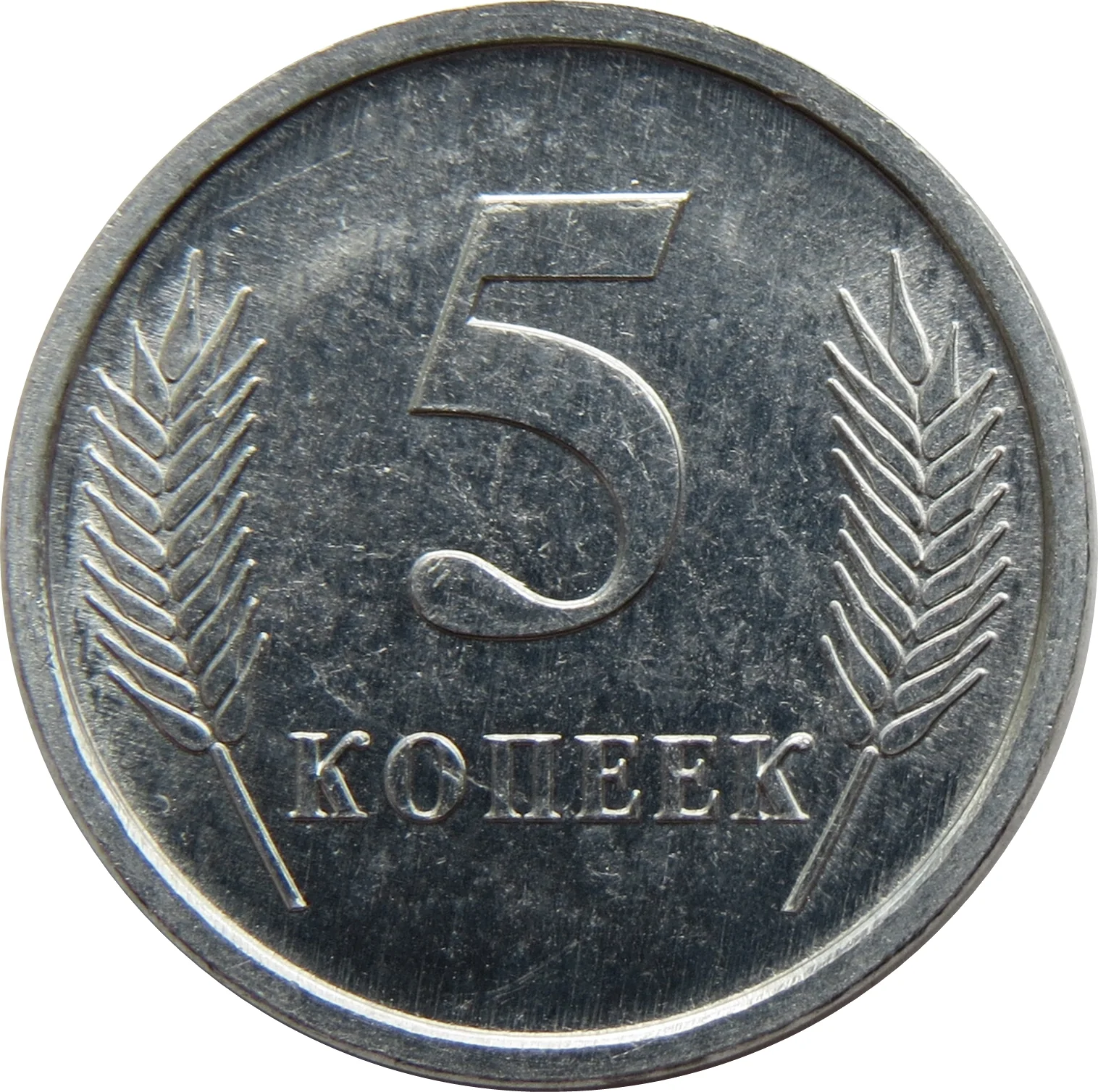 A 5-kopeck coin with wheat ears and the denomination in Cyrillic.