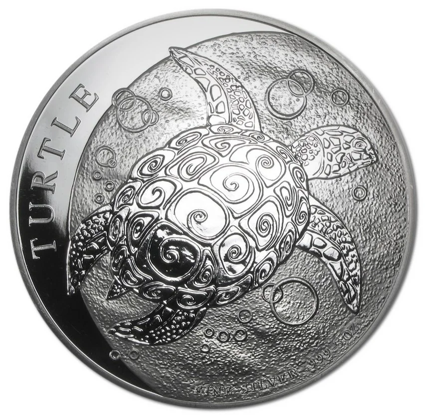 Turtle swimming left above weight and fineness marks.