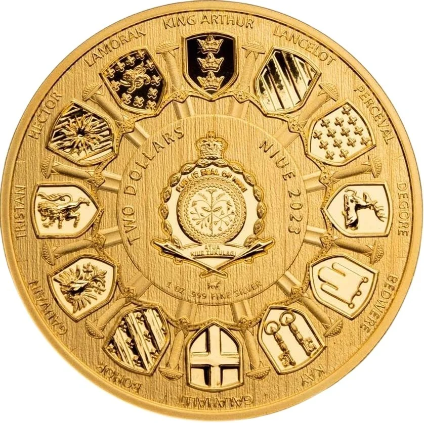 Twelve shields encircling a round table.