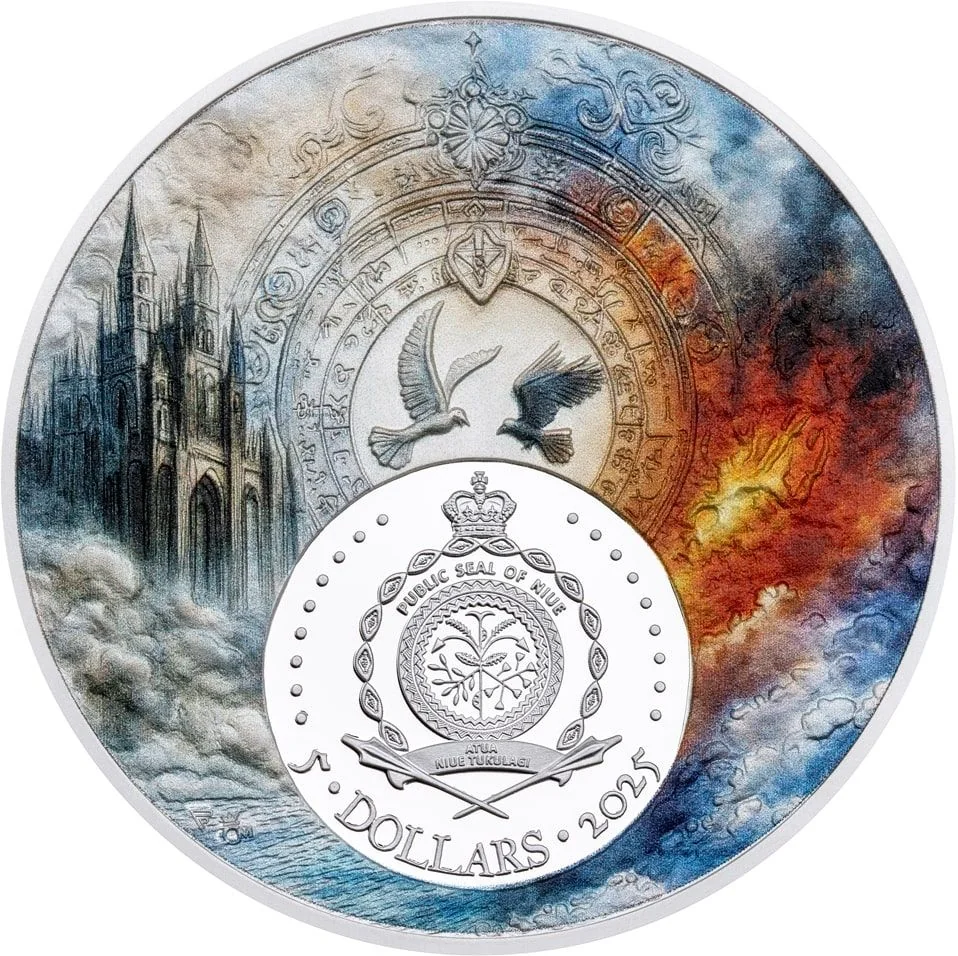 Coat of arms with a raven and dove, surrounded by mystical symbols of good and evil.