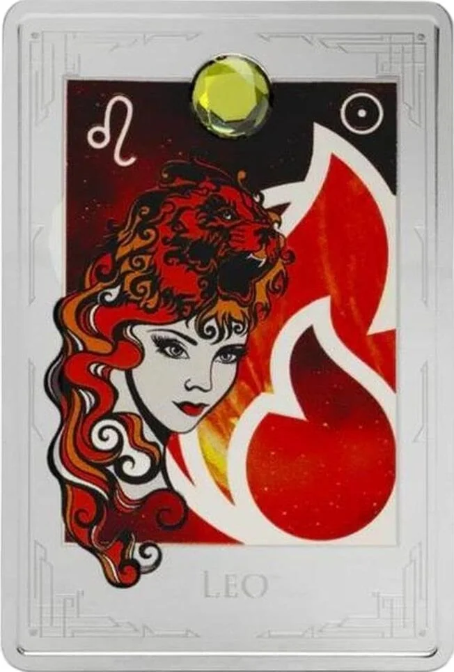 A stylized Leo figure in orange-red against a cosmic backdrop, featuring an inset peridot gemstone.