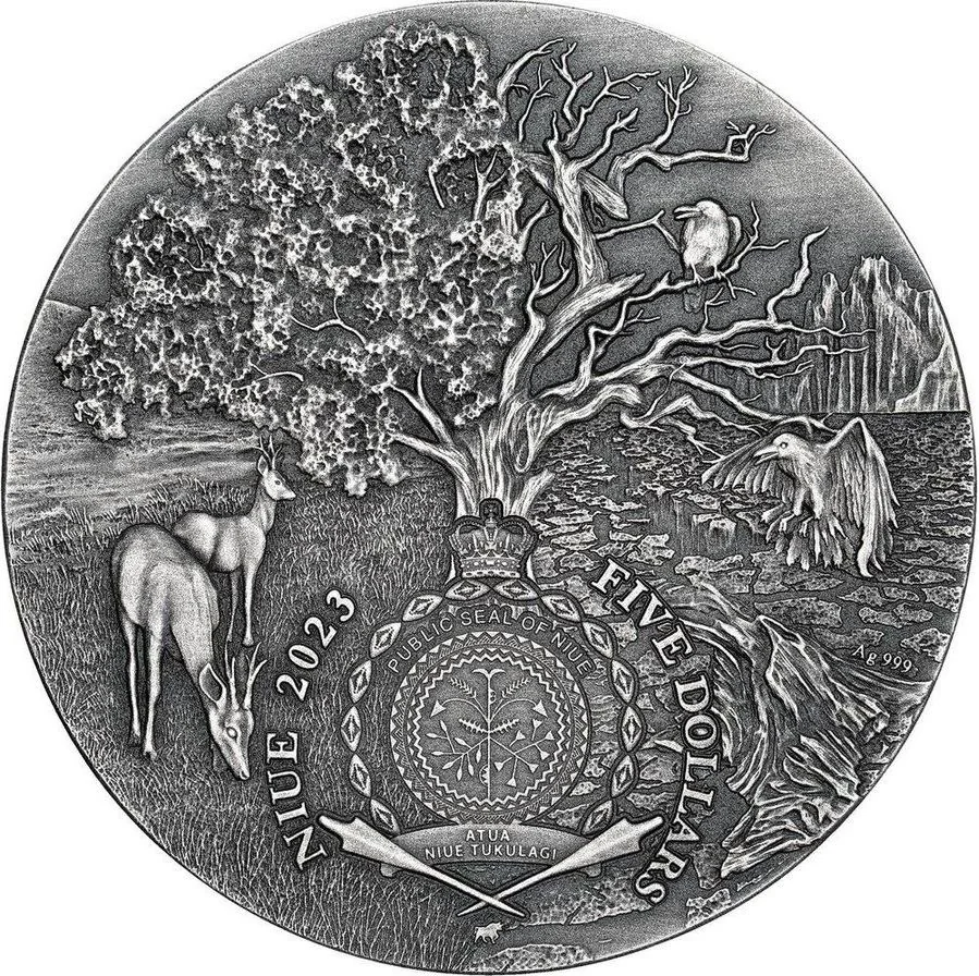 Description: A depiction of heaven and hell, divided by the Tree of Eden. The left side is fertile and tranquil; the right is barren and bleak. The tree itself is lush on the left and dead on the right, with the Public Seal of Niue beneath it.
