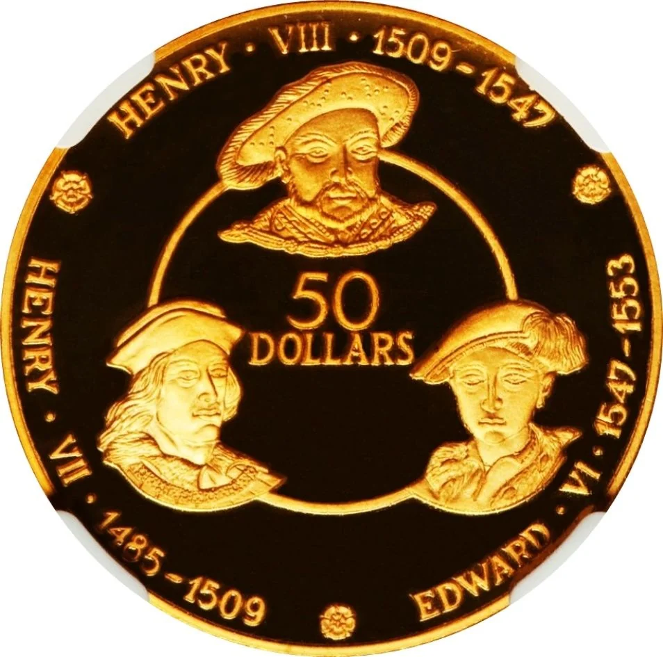 Tudor king busts encircling central denomination.