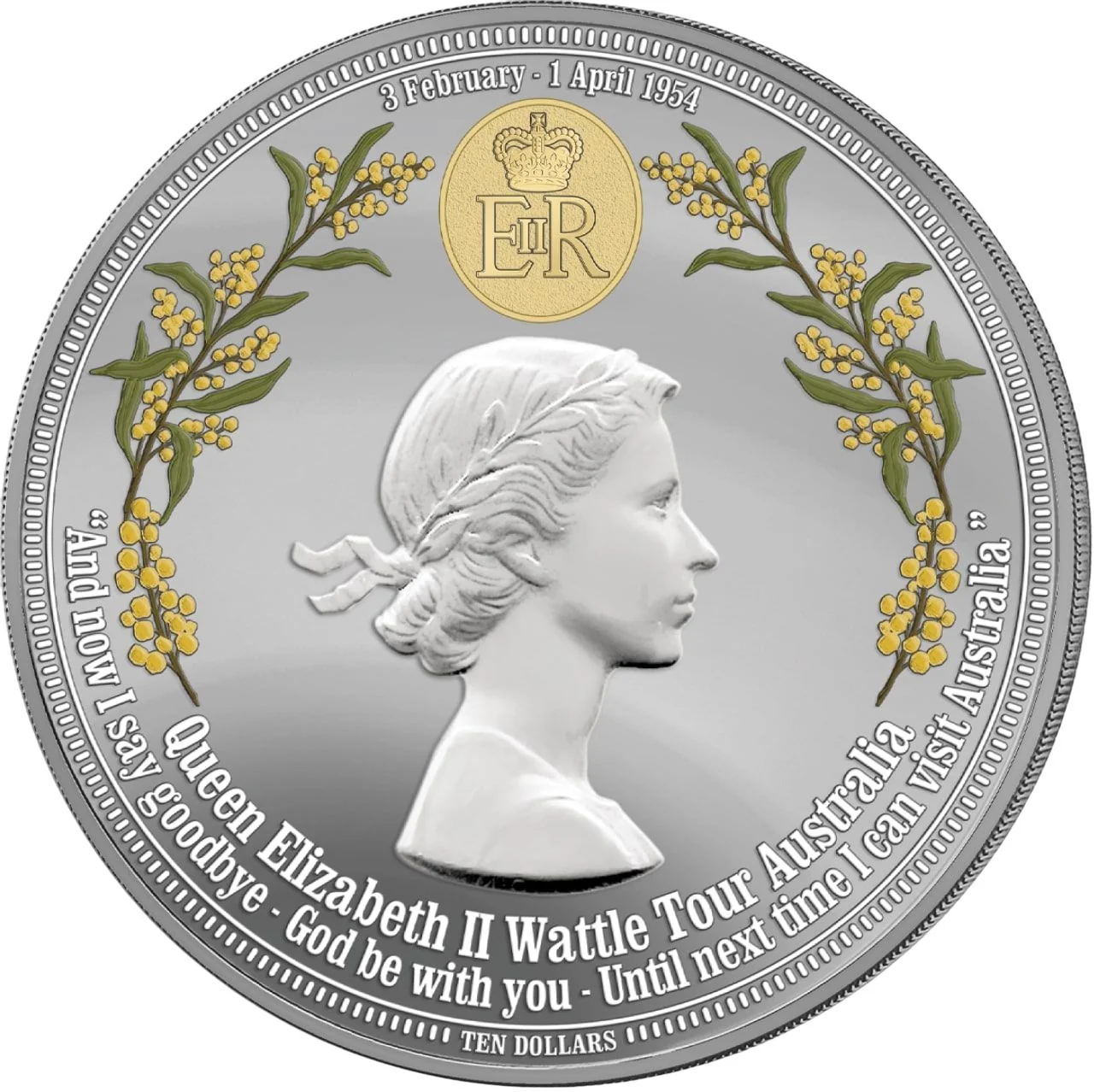 Description: A detailed portrait of the young Queen within an embossed wattle border.