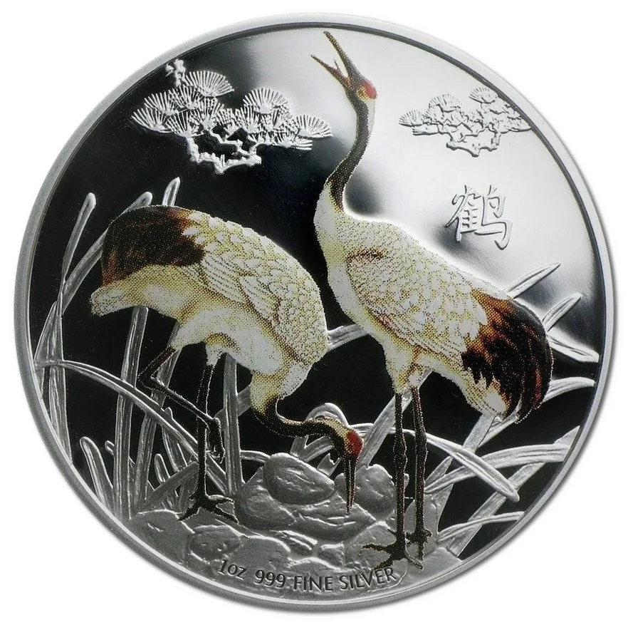 Two cranes among reeds and pines, symbolizing lasting friendship. One gazes upward, representing authority and wisdom.