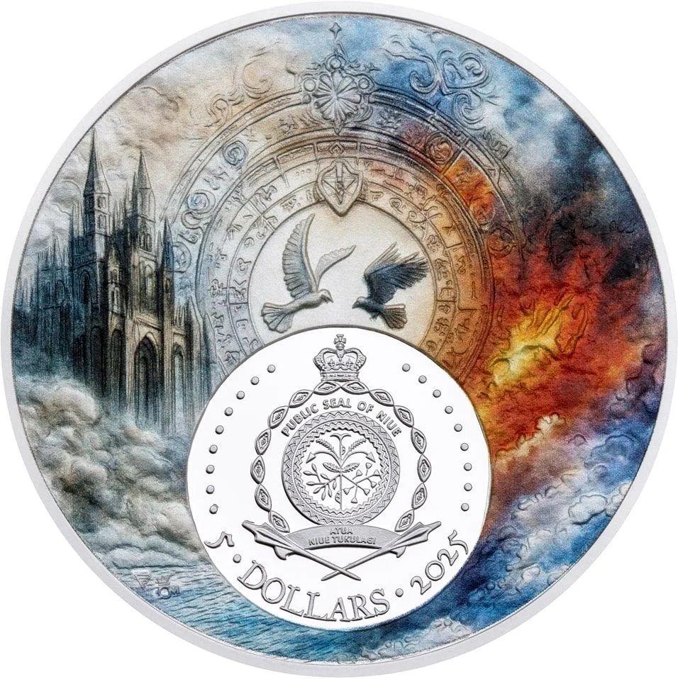 Coat of arms with a raven and dove, surrounded by mystical symbols of good and evil.