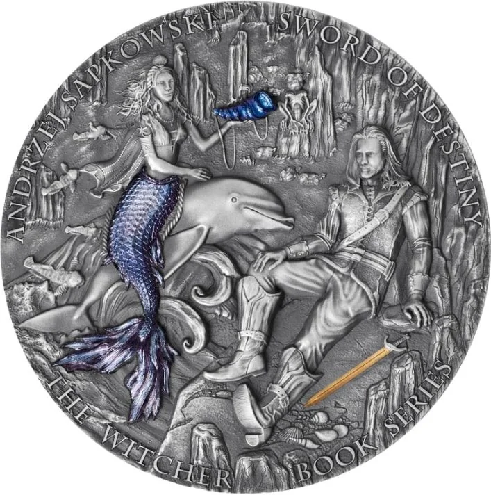 Geralt of Rivia, a rock bearing a gilded sword, a mermaid on a dolphin, and a conch-horn.