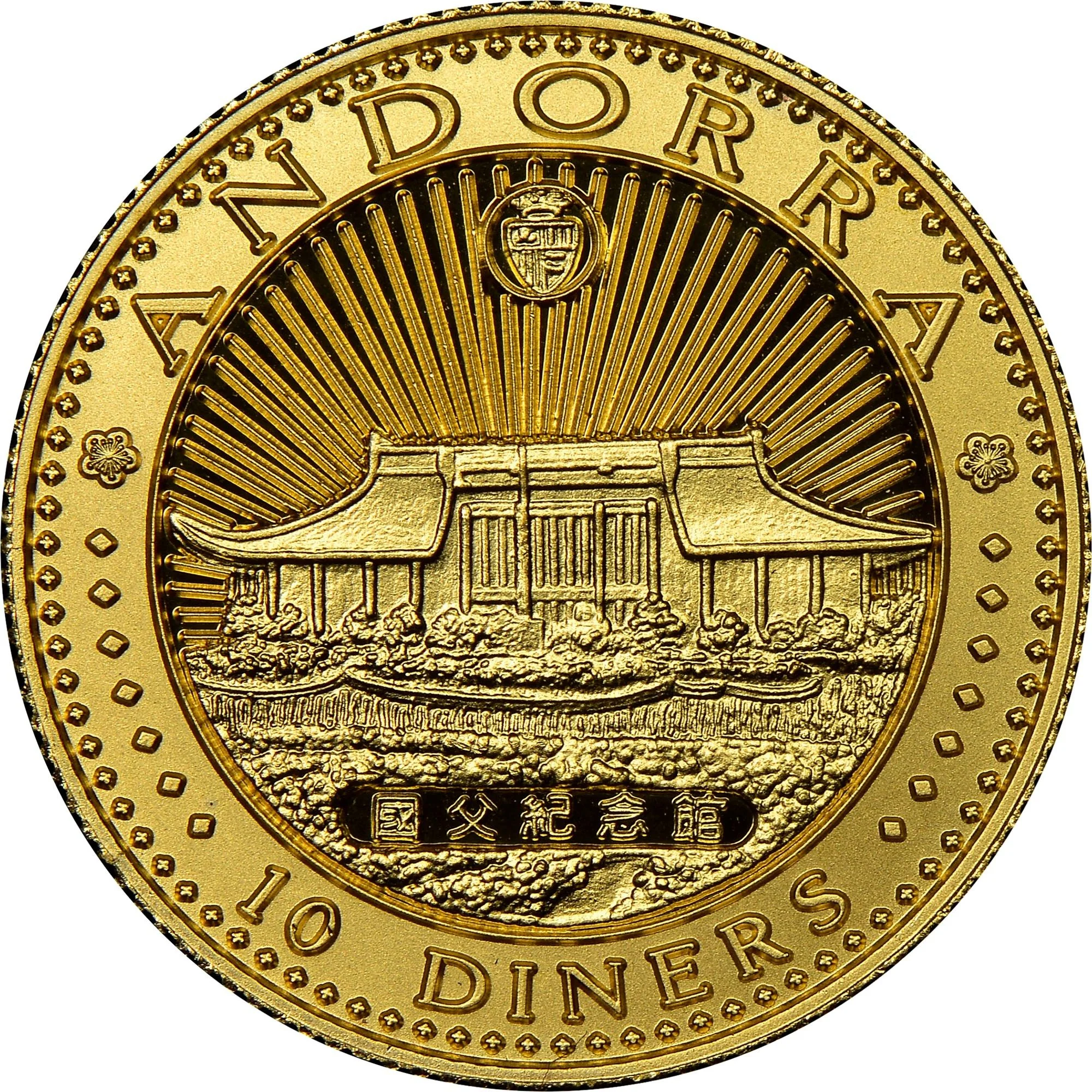 Traditional Chinese temple topped with lightning bolts and Andorra's coat of arms.