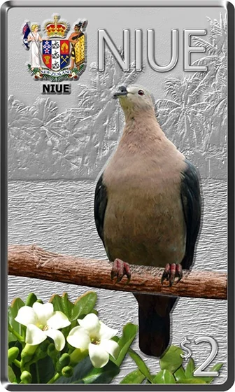 Colorized Pacific Pigeon with the Fagraea berteroana (Niue's flower) and the national coat of arms.