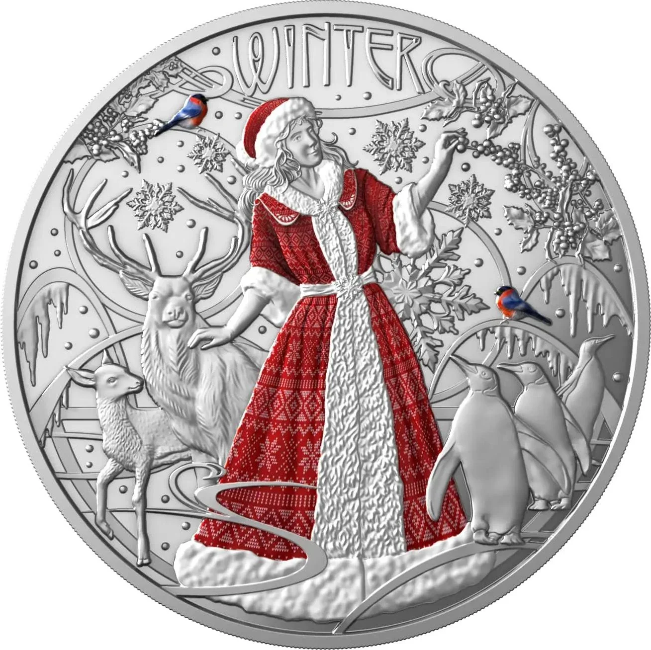 An elegant lady in a red cloak accompanied by deer, penguins, and a bullfinch.