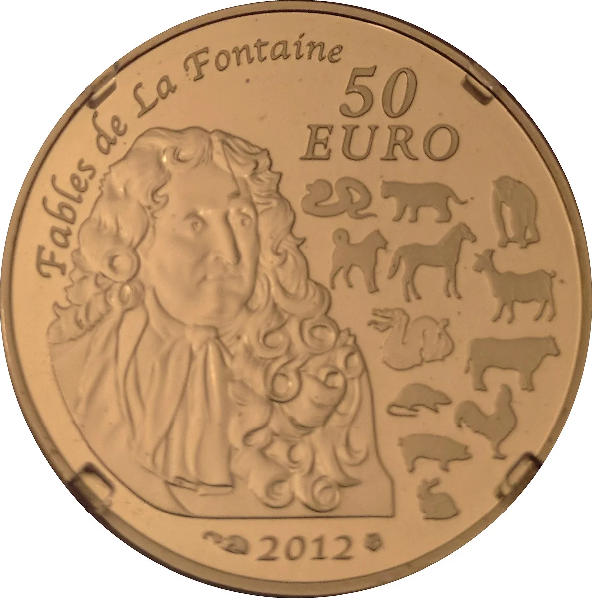 Portrait of Jean de la Fontaine and all animals of the Chinese zodiac.