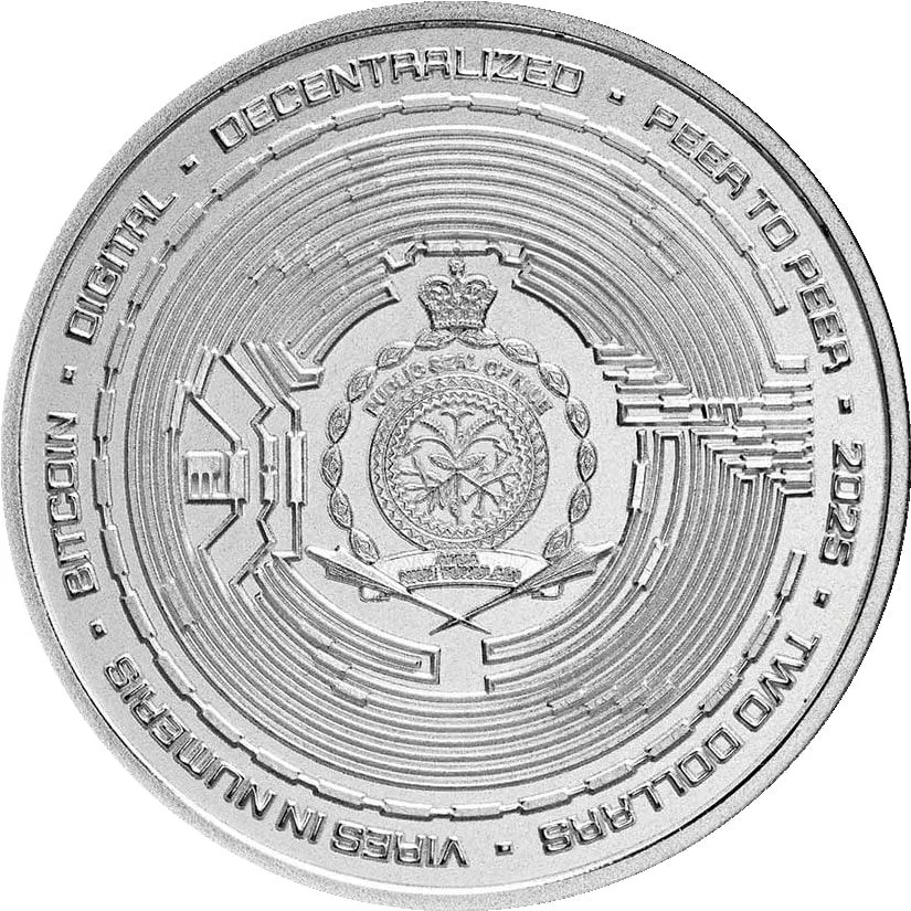 DECENTRALIZED · PEER TO PEER · 2025 · TWO DOLLARS · VIRES IN NUMERIS · BITCOIN · DIGITAL ·