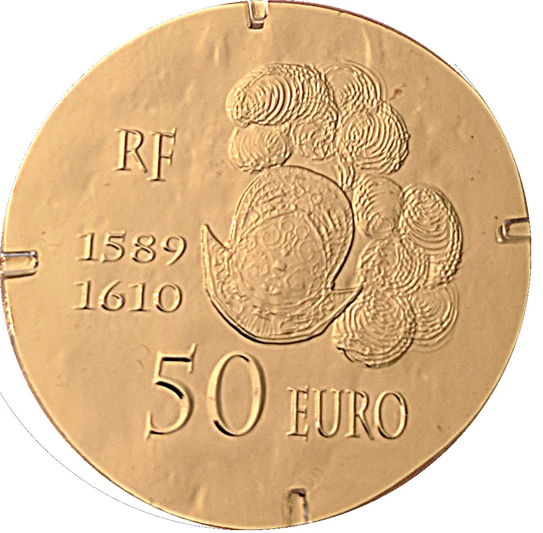 Henri IV's left profile with a strawberry, encircled by "HENRI IV" and the year.