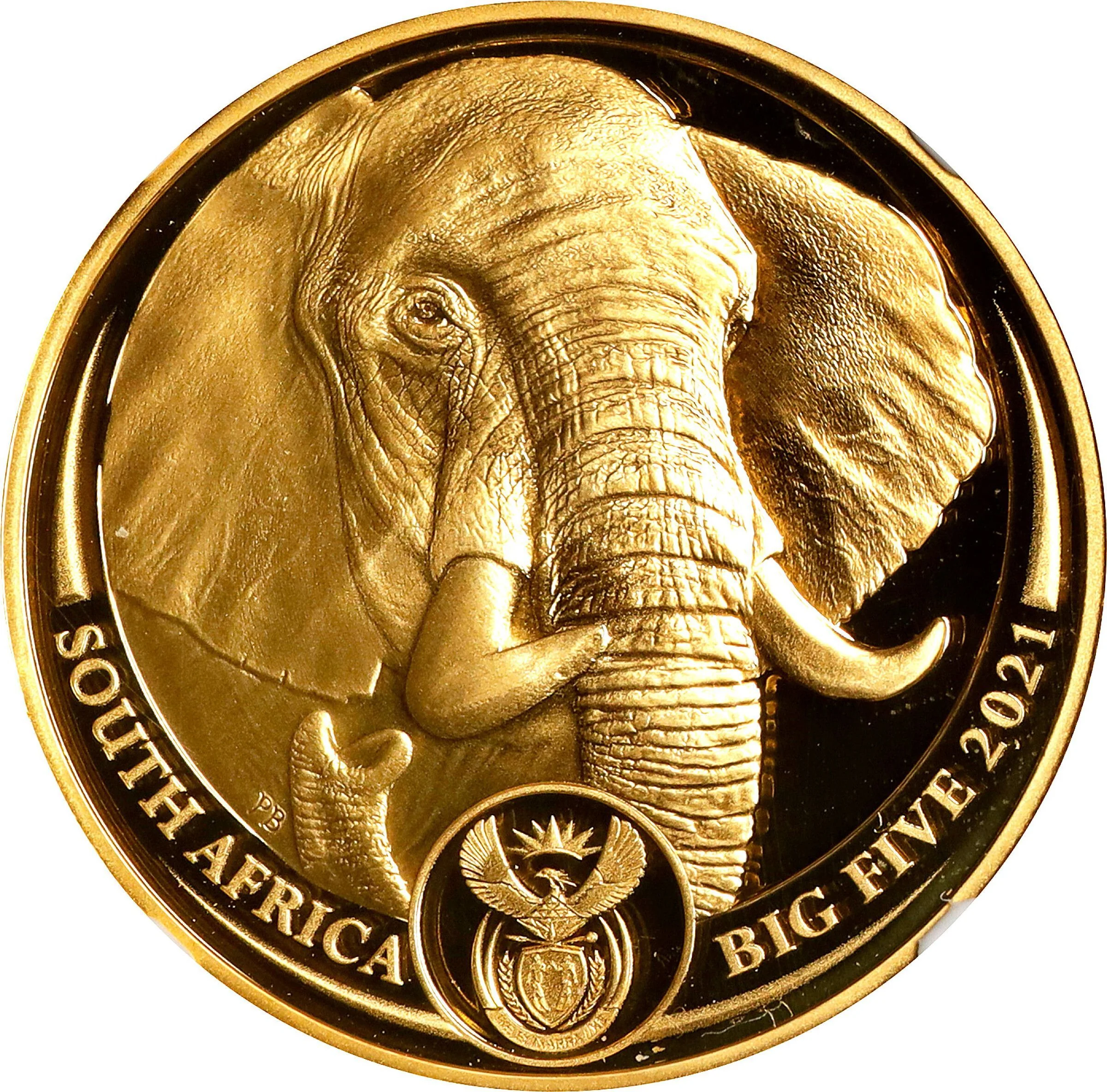 African Elephant facing forward, South African coat of arms centered below.