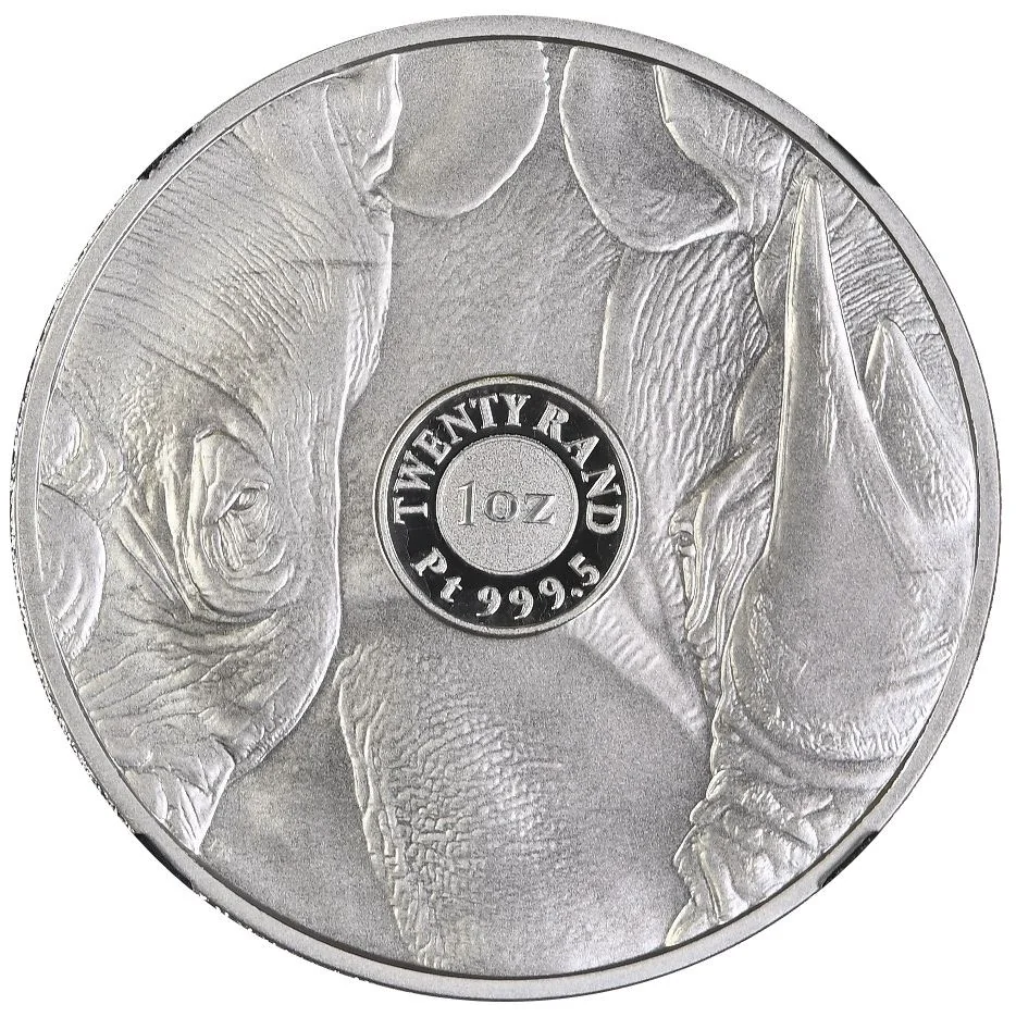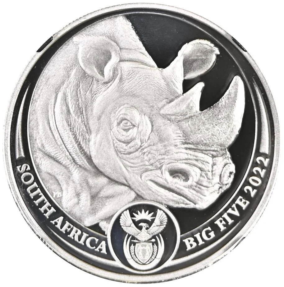 Black Rhino facing right, South African coat of arms below, text flanking the emblem.