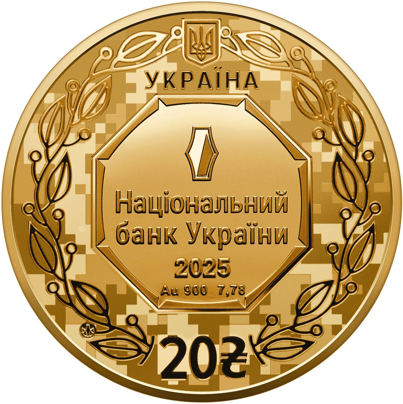 Ukraine's small coat of arms appears above a stylized laurel wreath against an MM-14 camouflage background. The center features the National Bank of Ukraine logotype in an octagonal cartouche, with the face value "20" and hryvnia symbol below.
