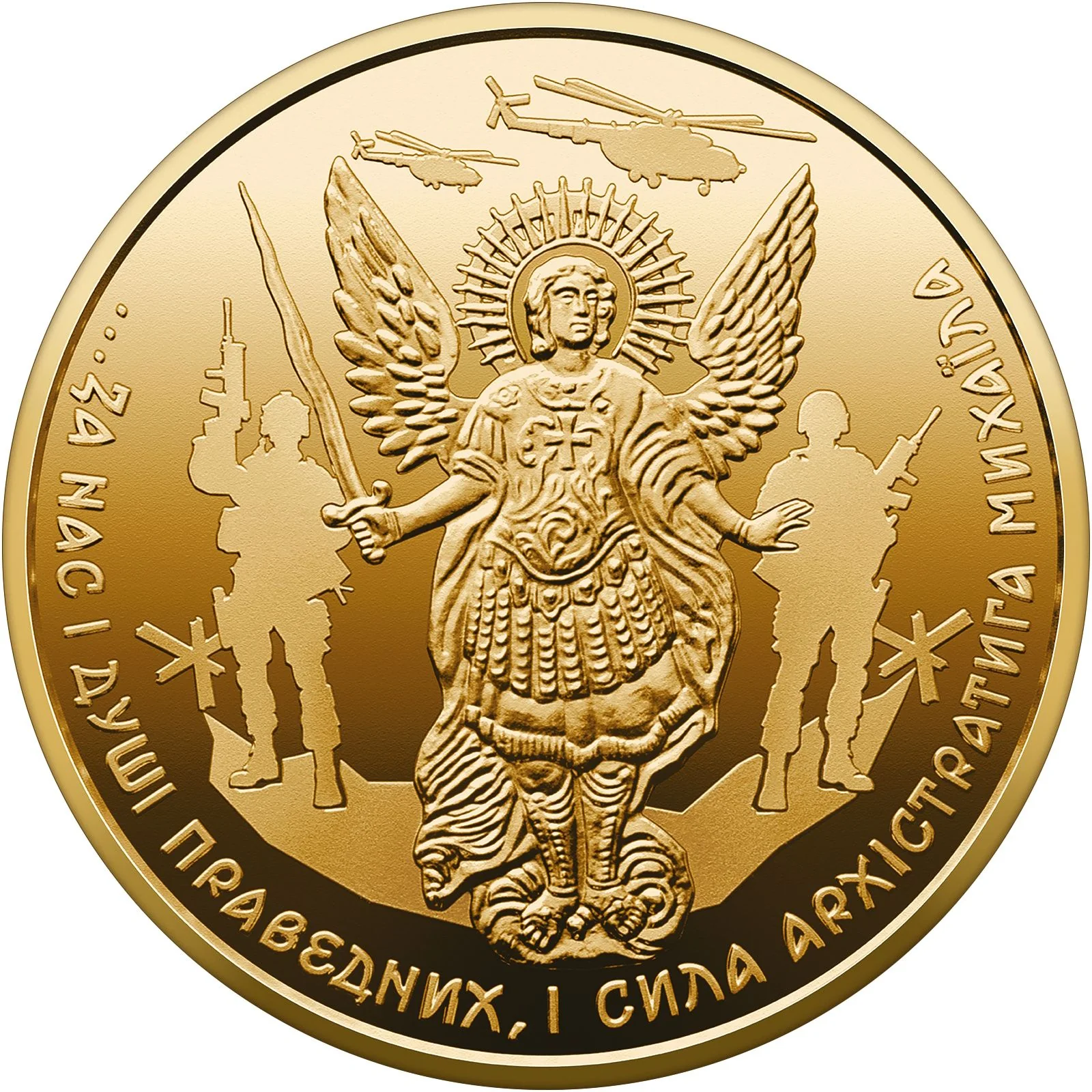 Archangel Michael flanked by Ukrainian soldiers and war symbols, encircled by lines from Shevchenko's "Haidamaky," representing Ukraine's fight for independence.