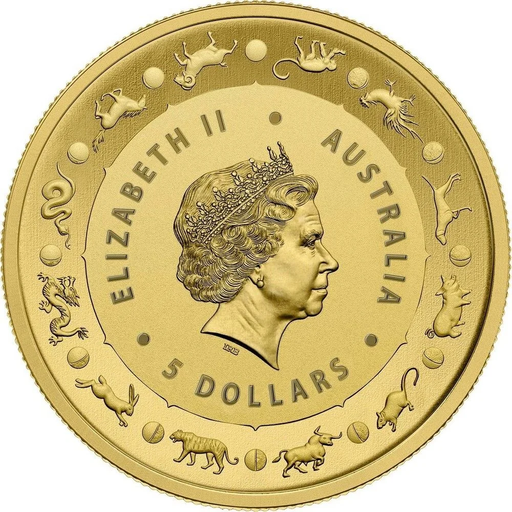 Queen Elizabeth IV facing right in the Girls of Great Britain and Ireland Tiara, encircled by the twelve Chinese zodiac signs.