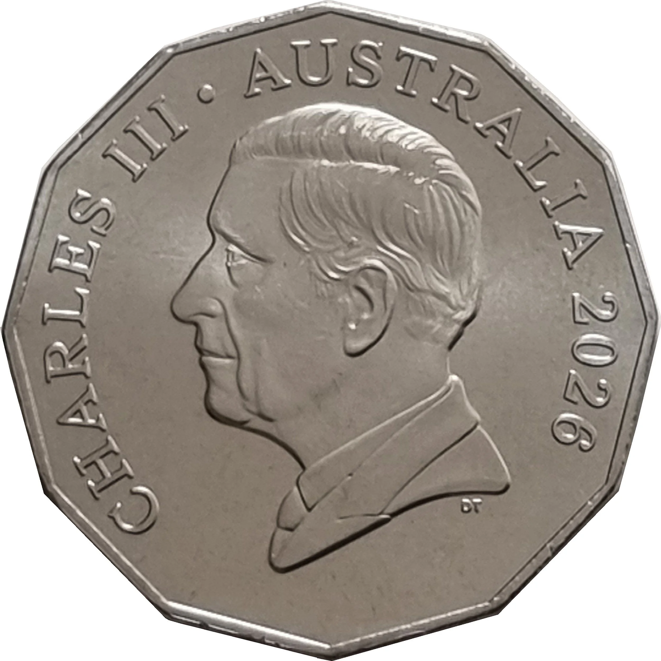 Uncrowned portrait of King Charles III facing left.