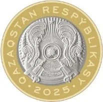 Central: National Coat of Arms. Circular inscription: QAZAQSTAN RESPÝBLIKASY. Date below.