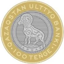 Around the circumference: QAZAQSTAN ULTTYQ BANKI. Below: 100 TEŃGE. The center shows a ring of national ornament encircling an argali image, with "ARQAR" beneath it.