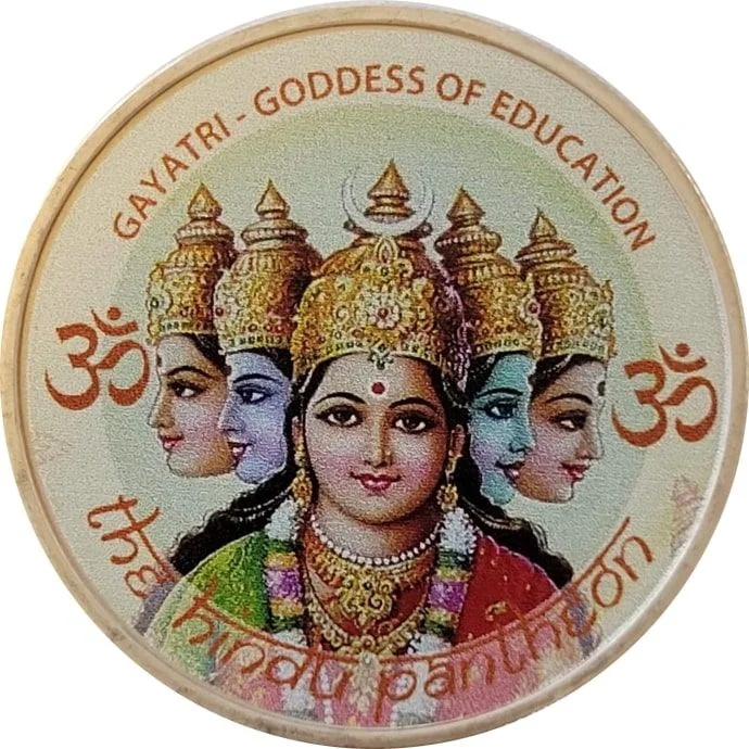 Goddess Gayatri with five crowned faces, each symbolizing a Veda, flanked by red Om symbols (ॐ).