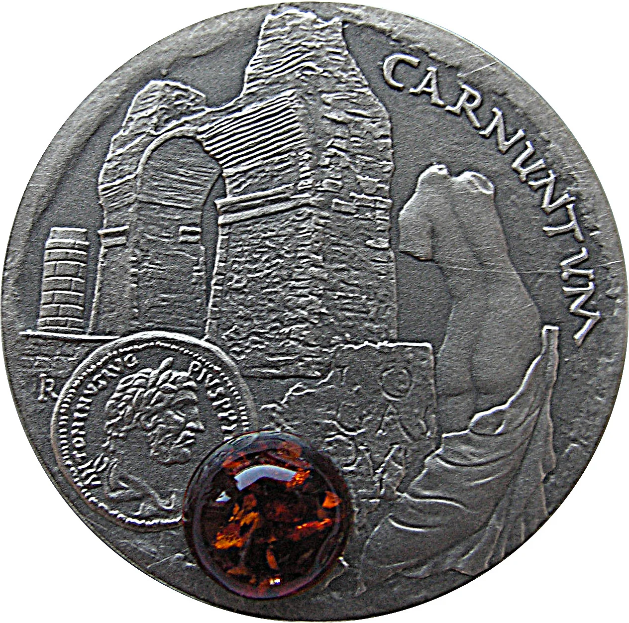 Amber stone with Roman coin.