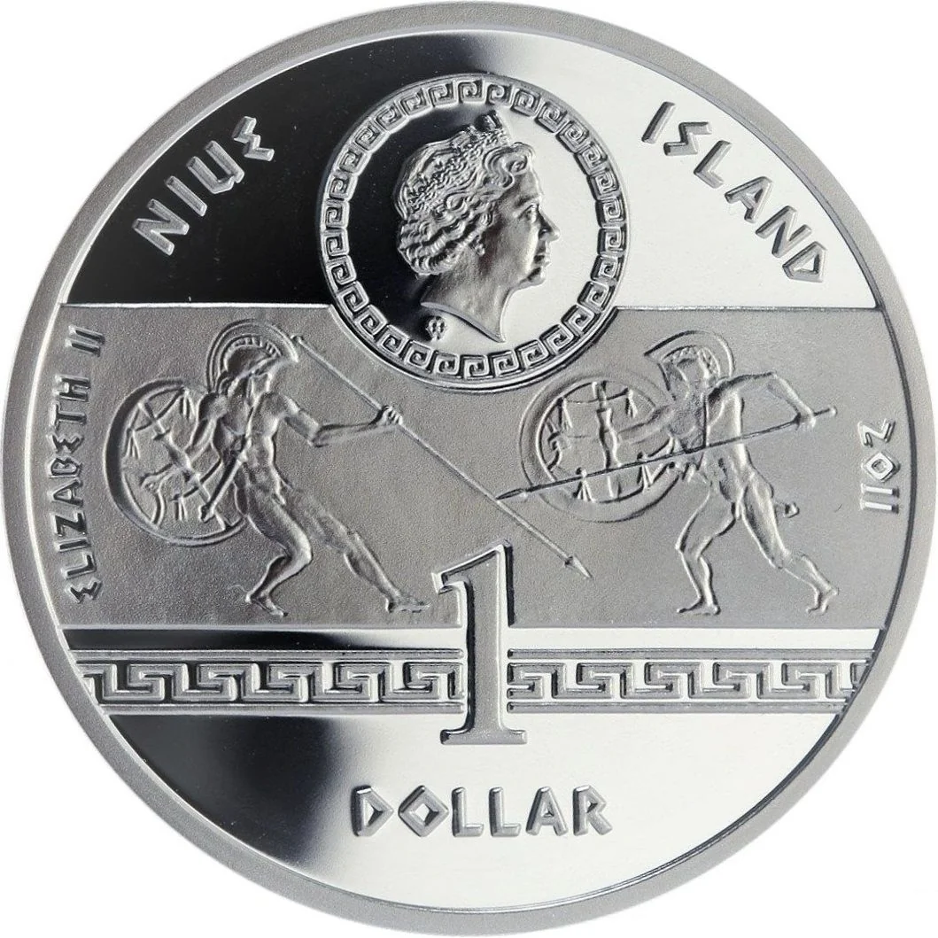 Bust of Elizabeth II right, above value and hoplite combat motif from vase painting.
