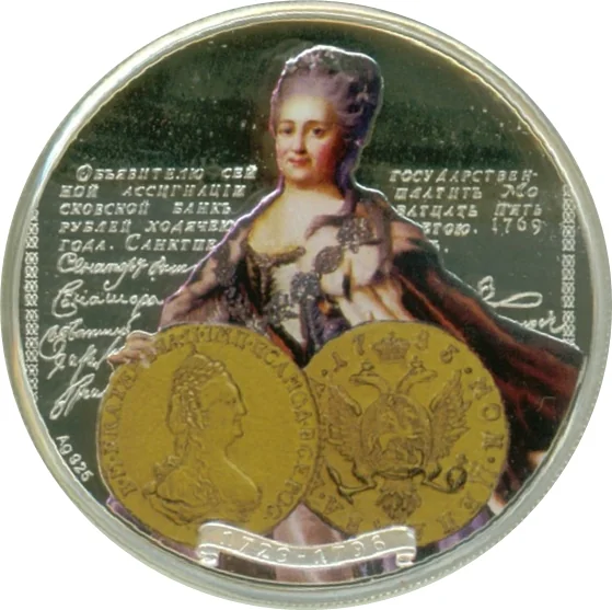 Catherine II holding a coin bearing her likeness.
