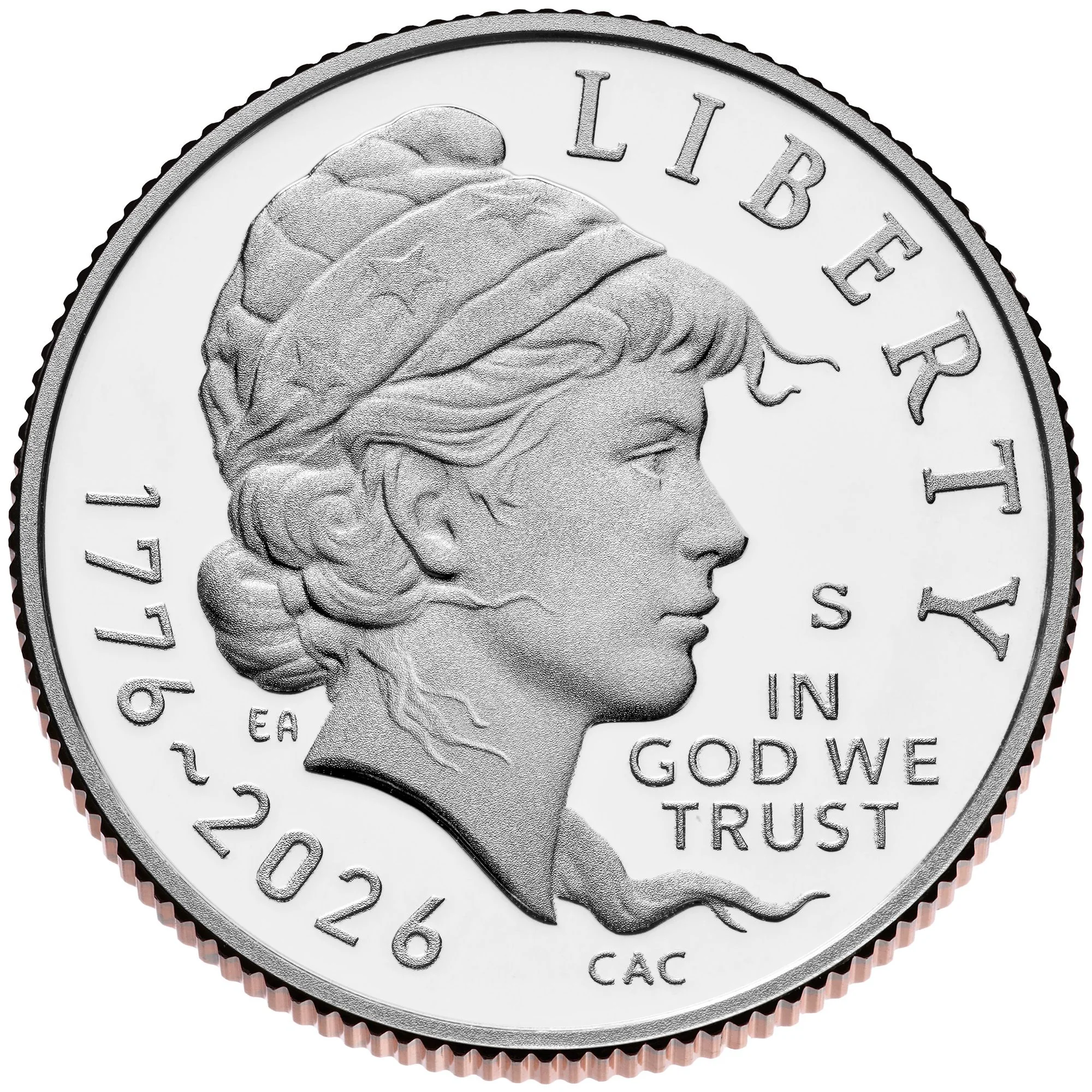 The obverse shows Liberty facing British rule, her hair swept by winds of revolution. Her starred and striped cap symbolizes the new nation and nods to early U.S. coinage.