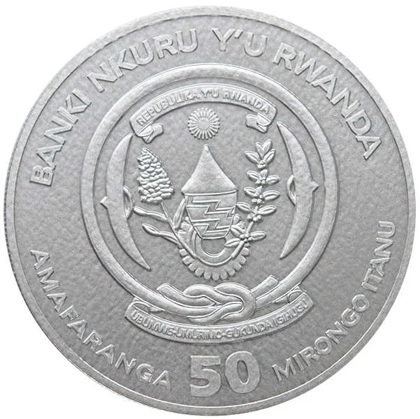 Description: Rwanda's coat of arms centers on a woven basket below a stylized sun, flanked by coffee and sorghum branches and traditional shields.