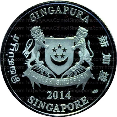 Emblem with date; 'Singapore' encircles it in English, Tamil, Chinese, and Malay.