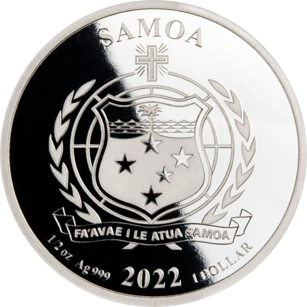 Samoa coat of arms, with weight, purity, date, and denomination below.
