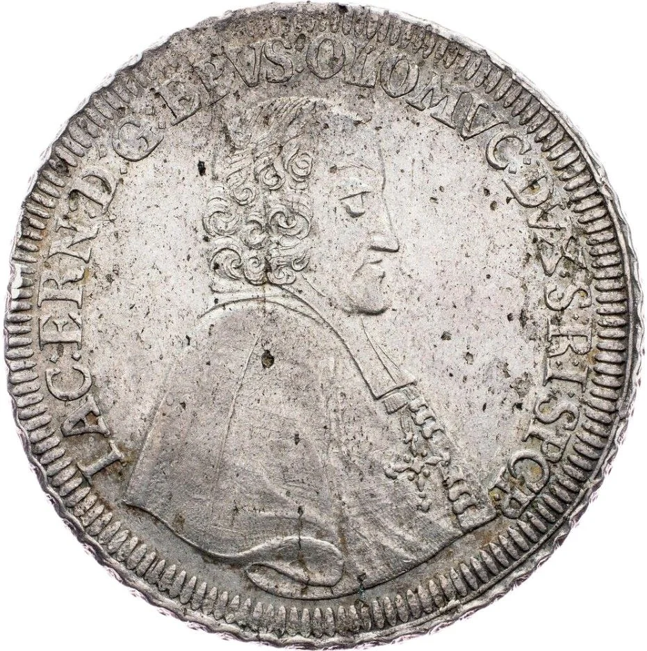 Description: Ornate shield with composite arms of the Olomouc Bishopric, topped by a smaller shield, mitre, and crown, crossed by sword and crozier, flanked by decorations. Legend around, date divided by shield.
