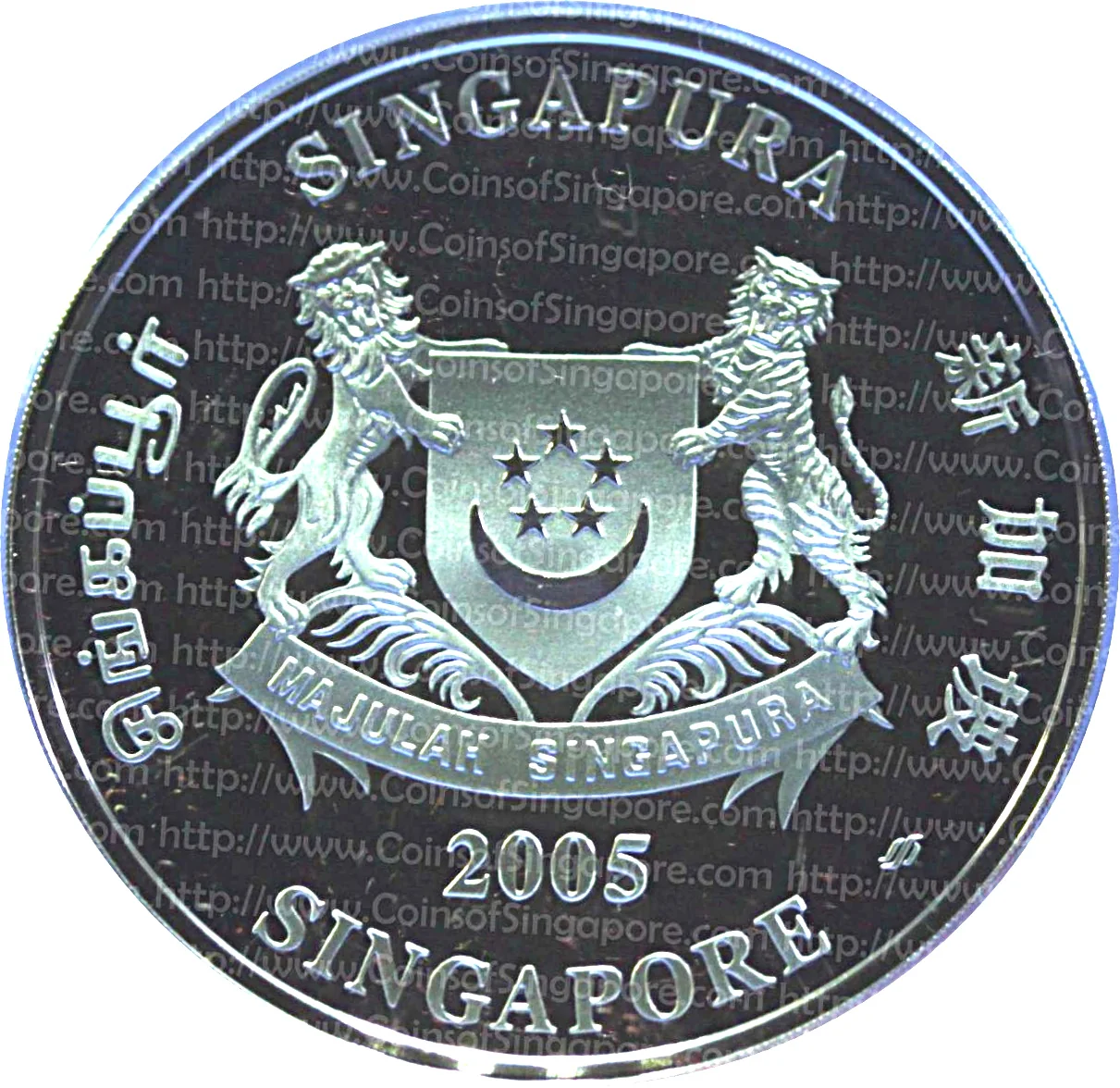 Emblem with date; 'Singapore' encircles it in English, Tamil, Chinese, and Malay.