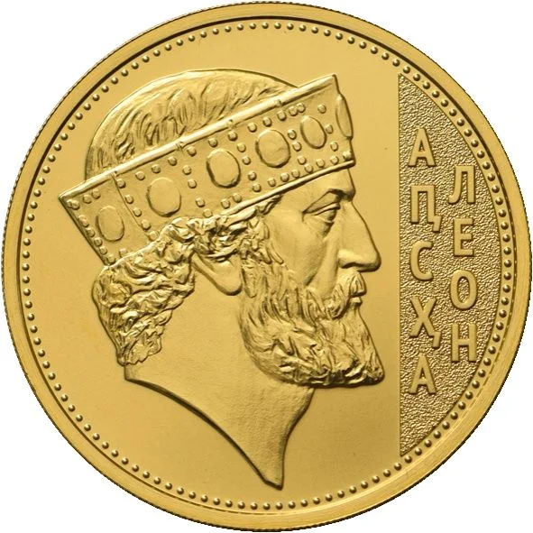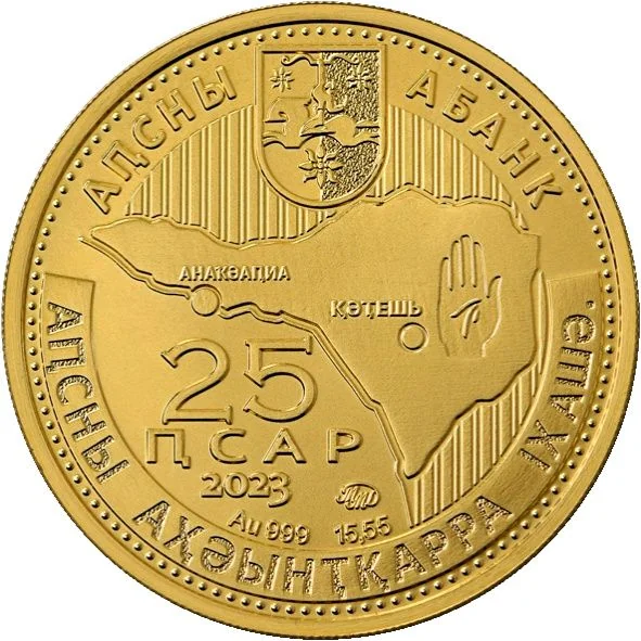Description: A map of the Abkhazian Kingdom, marked with the capitals “АНАҞӘАҧИА” and “ҚӘҬЕШЬ” and an open palm, is central. Above it, the inscription “Аҧсны Абанк” and the State Emblem are arranged in a semicircle.