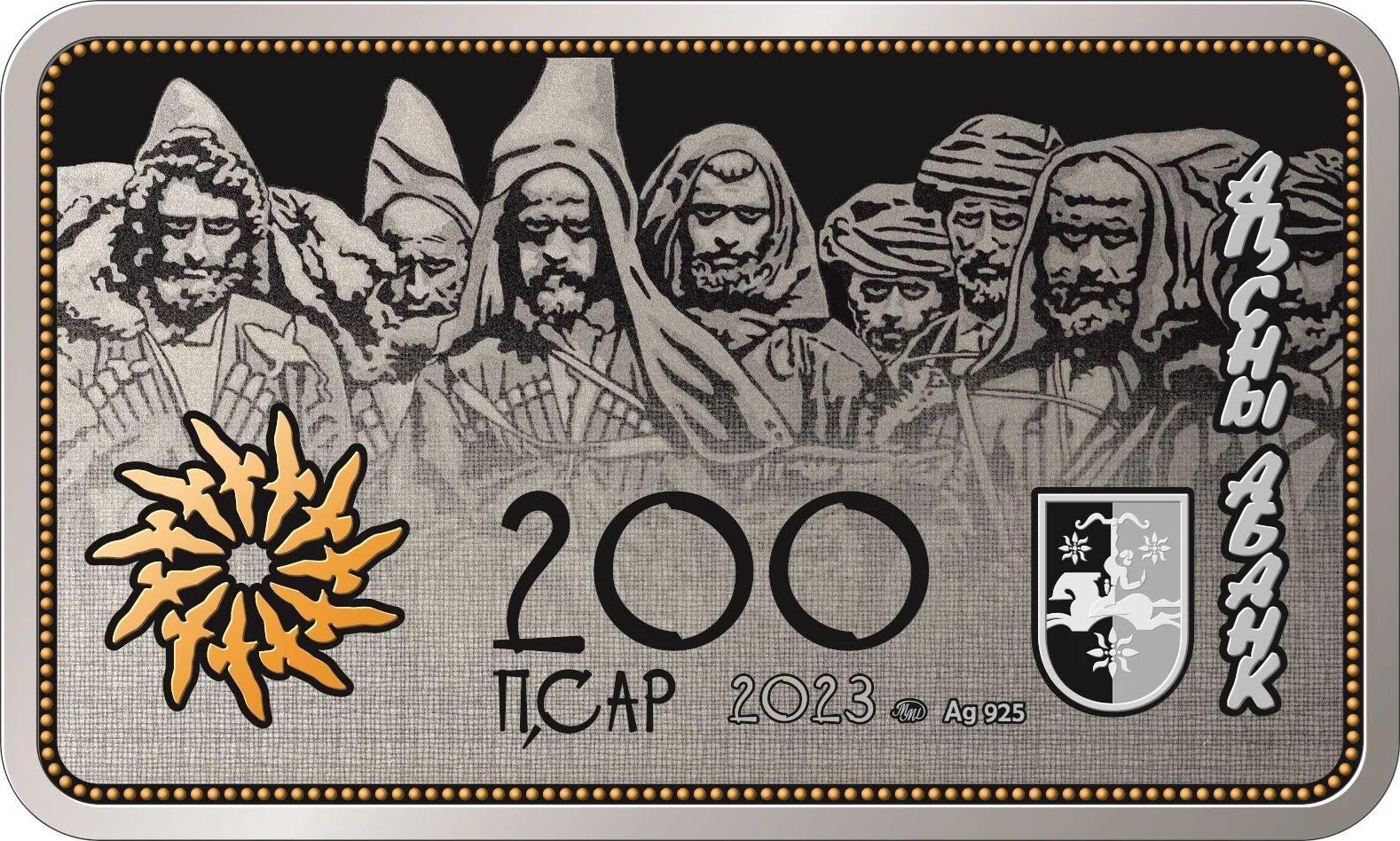 Description: The obverse features Abkhaz warriors from Dmitry Yermakov's photo "Abkhaz Deputies," a solar symbol of 11 soaring eagles on the left, and the inscription “Аҧсны Абанк” (Bank of Abkhazia) with the State Emblem on the right.