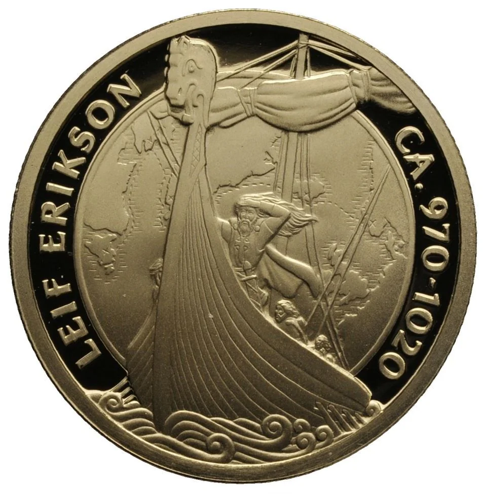 Leif Erikson on a Viking ship, with a map of the North Atlantic and surrounding lands behind him.